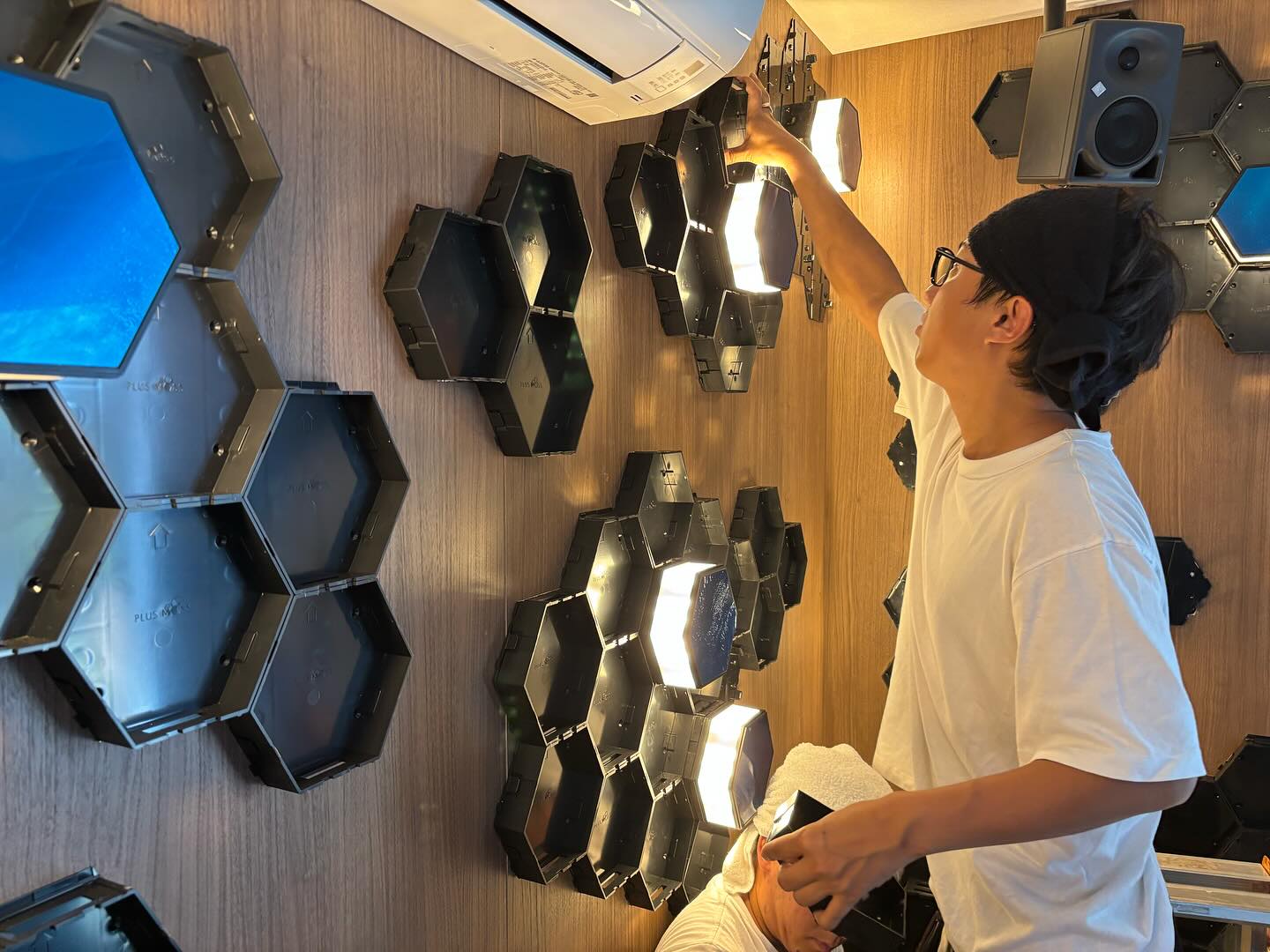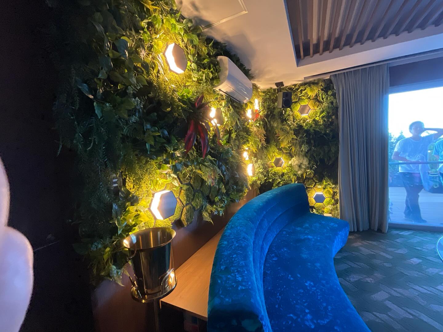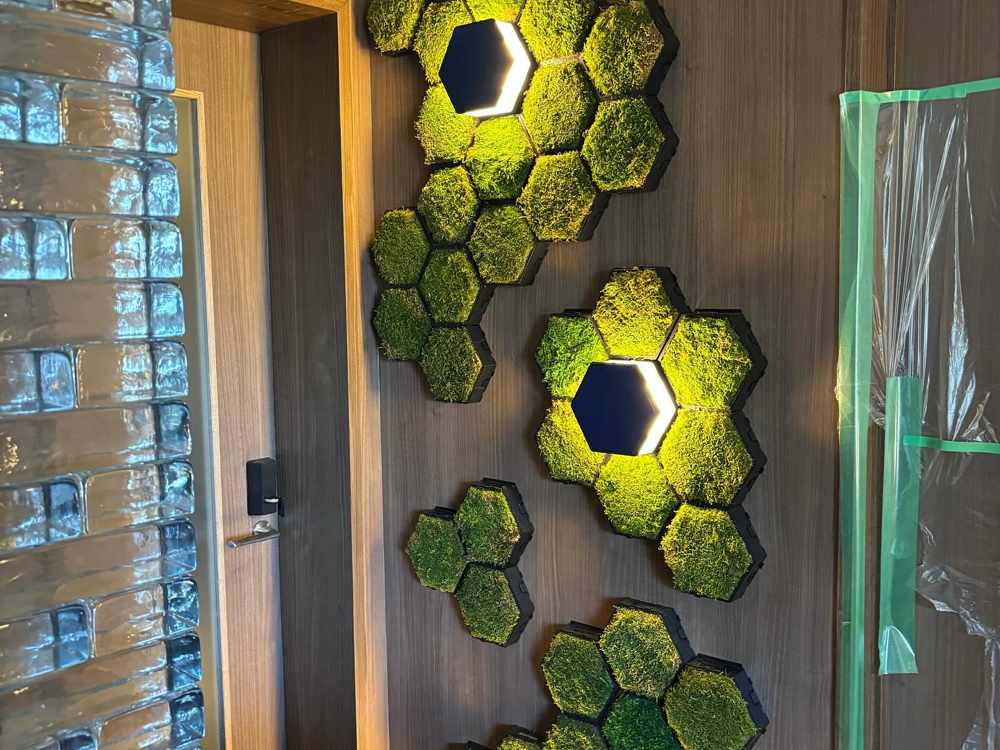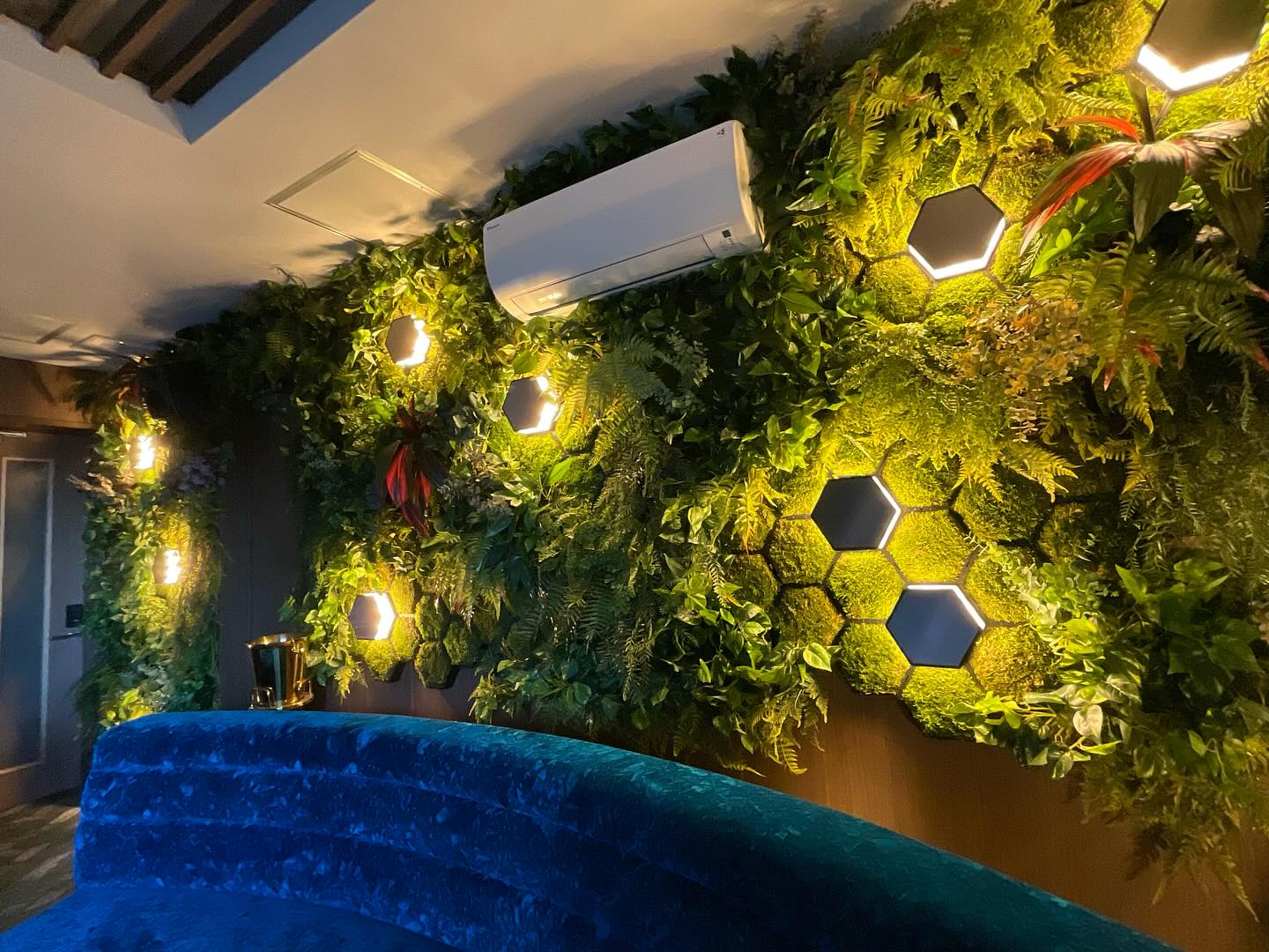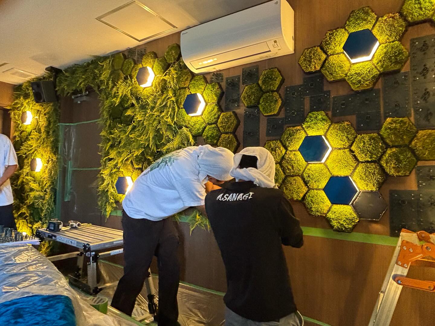 本施工では、深いグリーンの人工苔・植物の中に、アクセントとなる六角形のデザイン照明を埋め込むことで、奥行きとムーディーな雰囲気を創出しました。